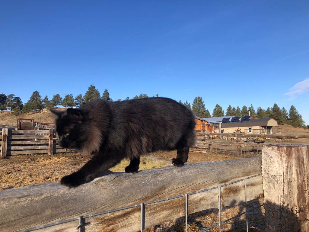 Suzie! This silver-necked sweetheart loves to tag along on barnyard chores. Usually she is up on fenceposts safely away from the intent stares of Maverick.