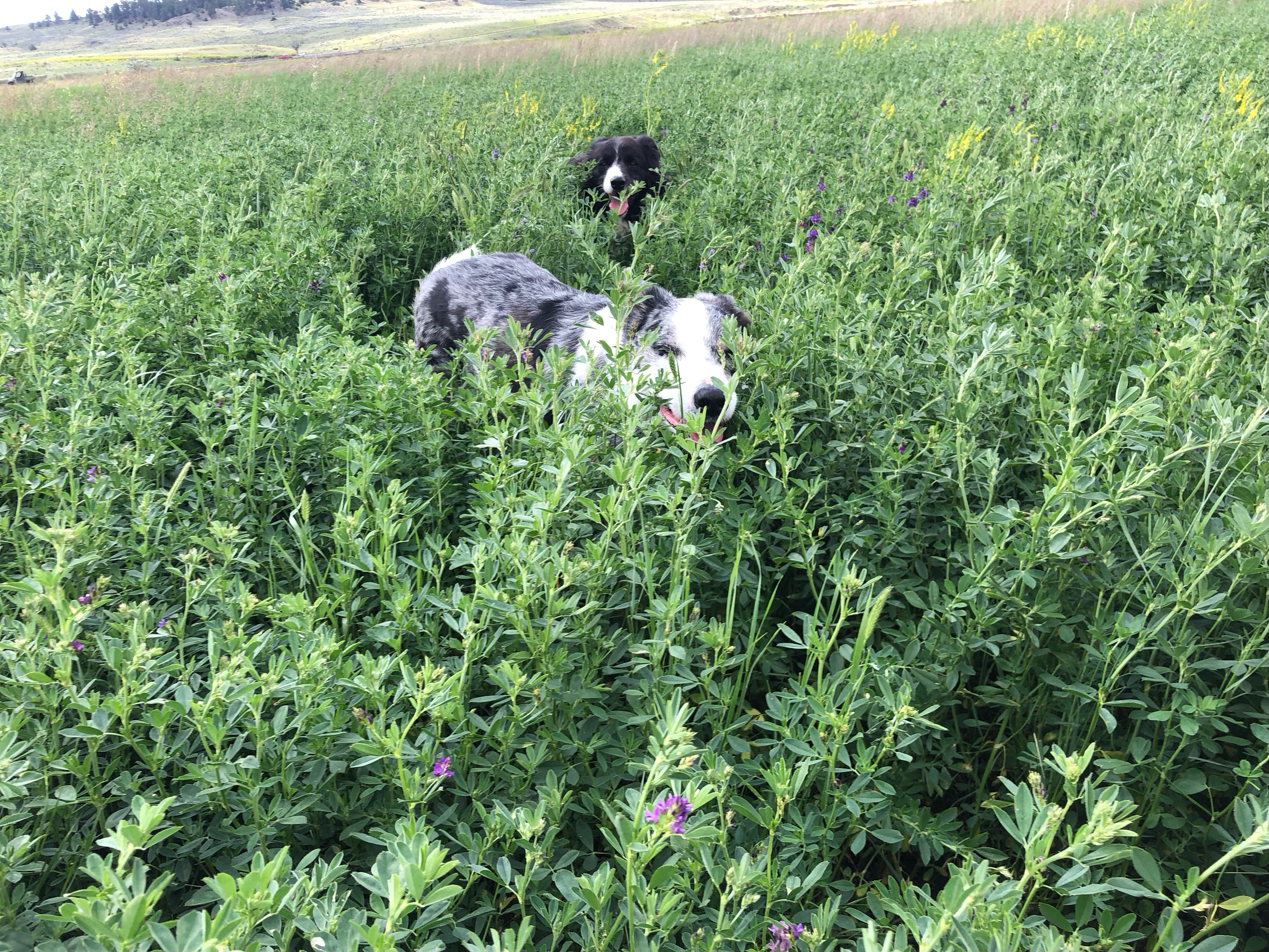 Maverick and Scooter are swallowed up by lush growth in our irrigated alfalfa fields.