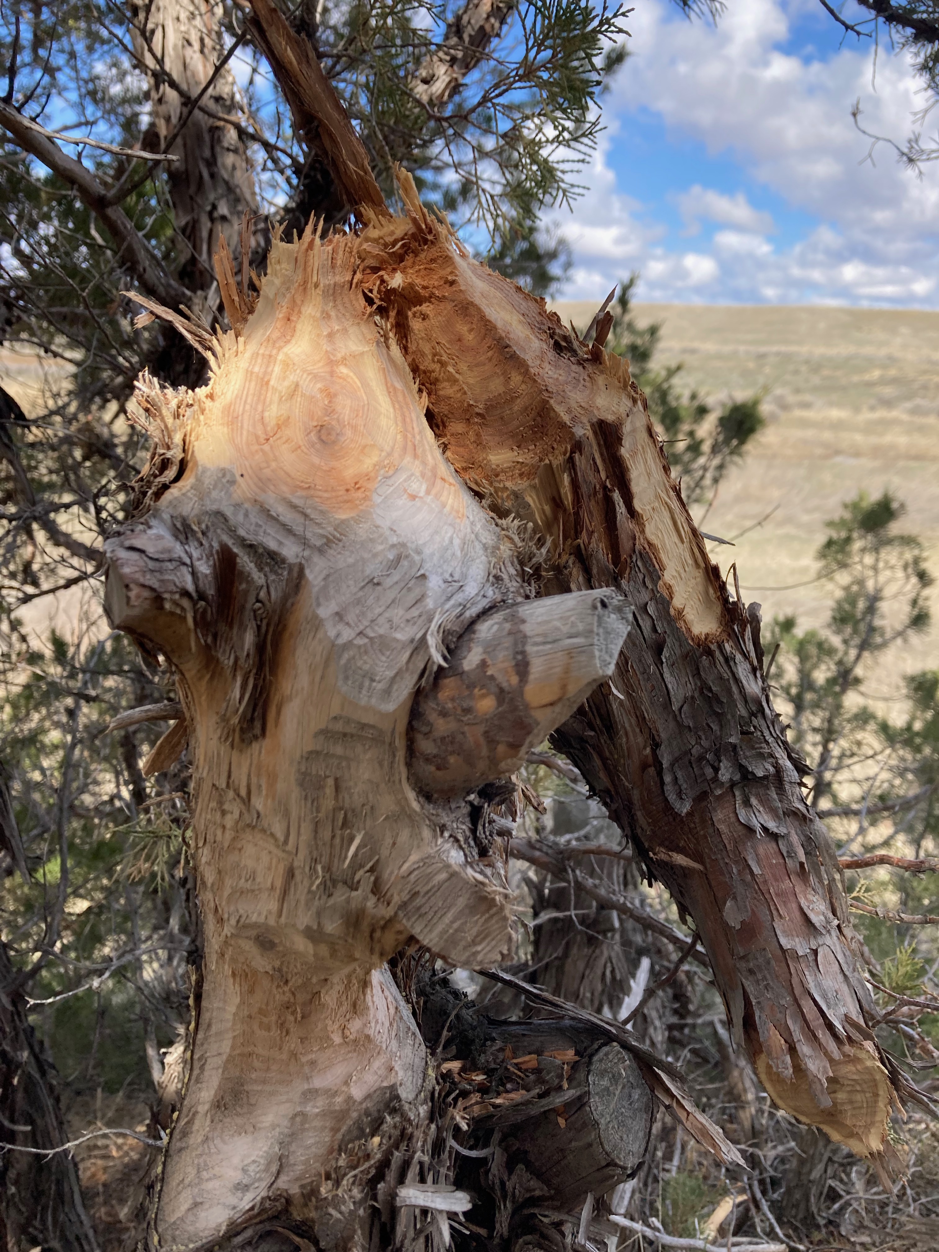 The beavers of Coulee Creek have been busy. Rocky Mountain Juniper is a very dense wood – great for keeping the teeth worn to an appropriate length. All rodents, including beaver, need to munch on woody food to whittle their ever-growing teeth down. The beavers’ primary food source here is the fibrous roots of bullrushes, but they still feed on the ponderosa pines and junipers occasionally.