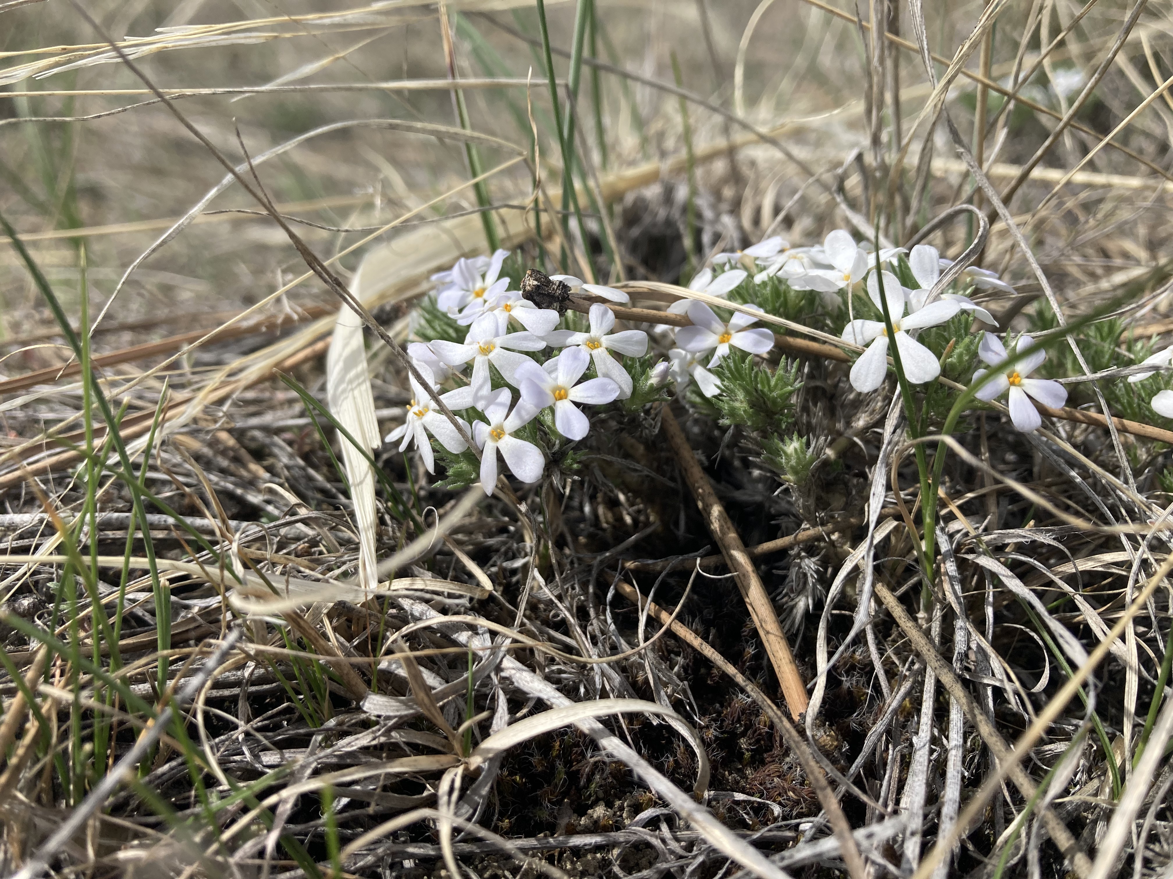 One can rely on spiny phlox to be the first blooms on the prairie every spring. With its low-growing habit and tiny, hairy leaves, it can flourish in the colder, harsher weather of late March and early April. Following on its heels will be the delicate yellow blooms of Nuttall’s violets, five-petaled star lilies, and the prairie golden beans of late April.