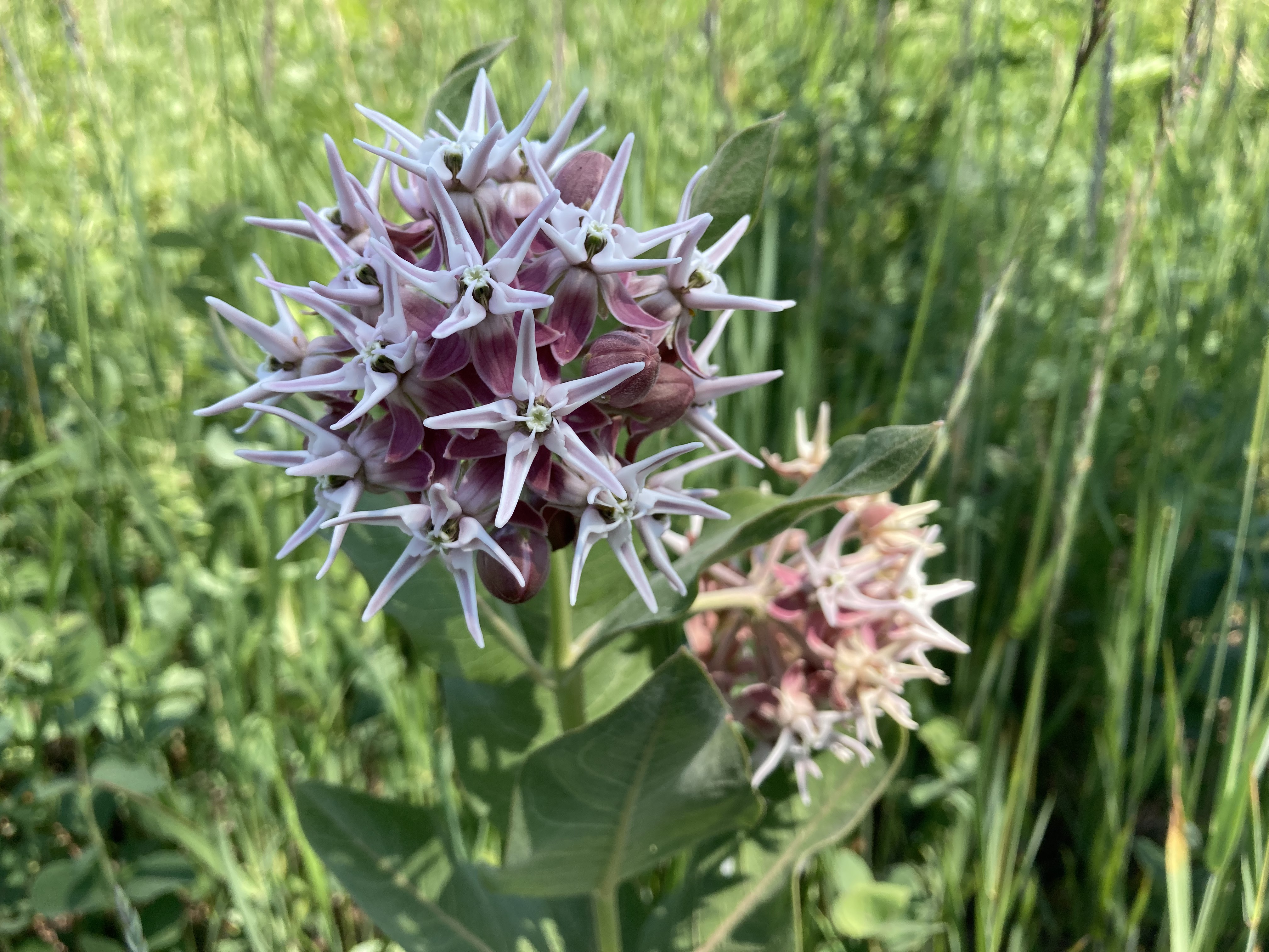 Ample spring rains brought forth loads of wildflowers across the prairie. The milkweed in particular is having quite a heyday! Its blossoms are tessellated with star-shaped mauve flowers whose arms reach skyward to welcome in their pollinators. And what a complex process that is! Milkweed make waxy packets of pollen in pairs called pollinia that are tucked inside special pouches at the base of the stigma (the center of the star). While sipping on nectar from the base of each star-arm petal, the pollinators (bees, wasps, butterflies, moths, et al) accidentally step on slits next to the pouches that hold the pollinia. With luck, the insect successfully retracts its leg from the slit and pulls the pollinia out along with it. Then it takes its sticky cargo to another milkweed plant, and with a little more luck it inserts that same leg accidentally into another slit and deposits the pollinia, thereby fertilizing the flower. What a magical and elaborate process which requires quite a bit of luck! For some great photos and detailed description, head over to this NRCS article.