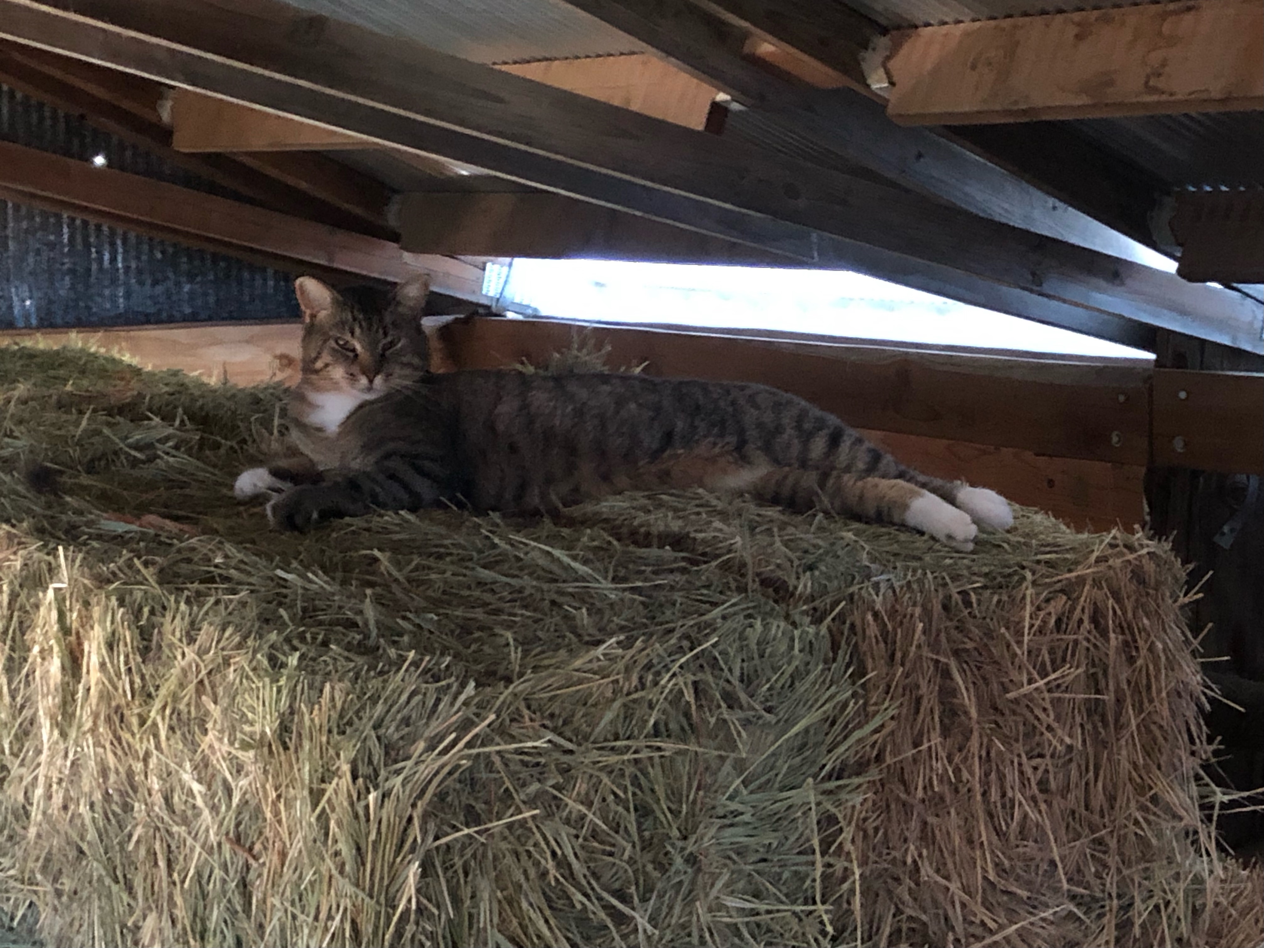 A rare close-up of Oliver, our wildest barn cat. Having shown up out of thin air one spring, he remains skittish around people. The loft of the barn is his safe spot where he lounges comfortably beneath the rafters. If I sit down on a bale of hay quietly for awhile, he’ll make his way over to my lap for some lovin’.