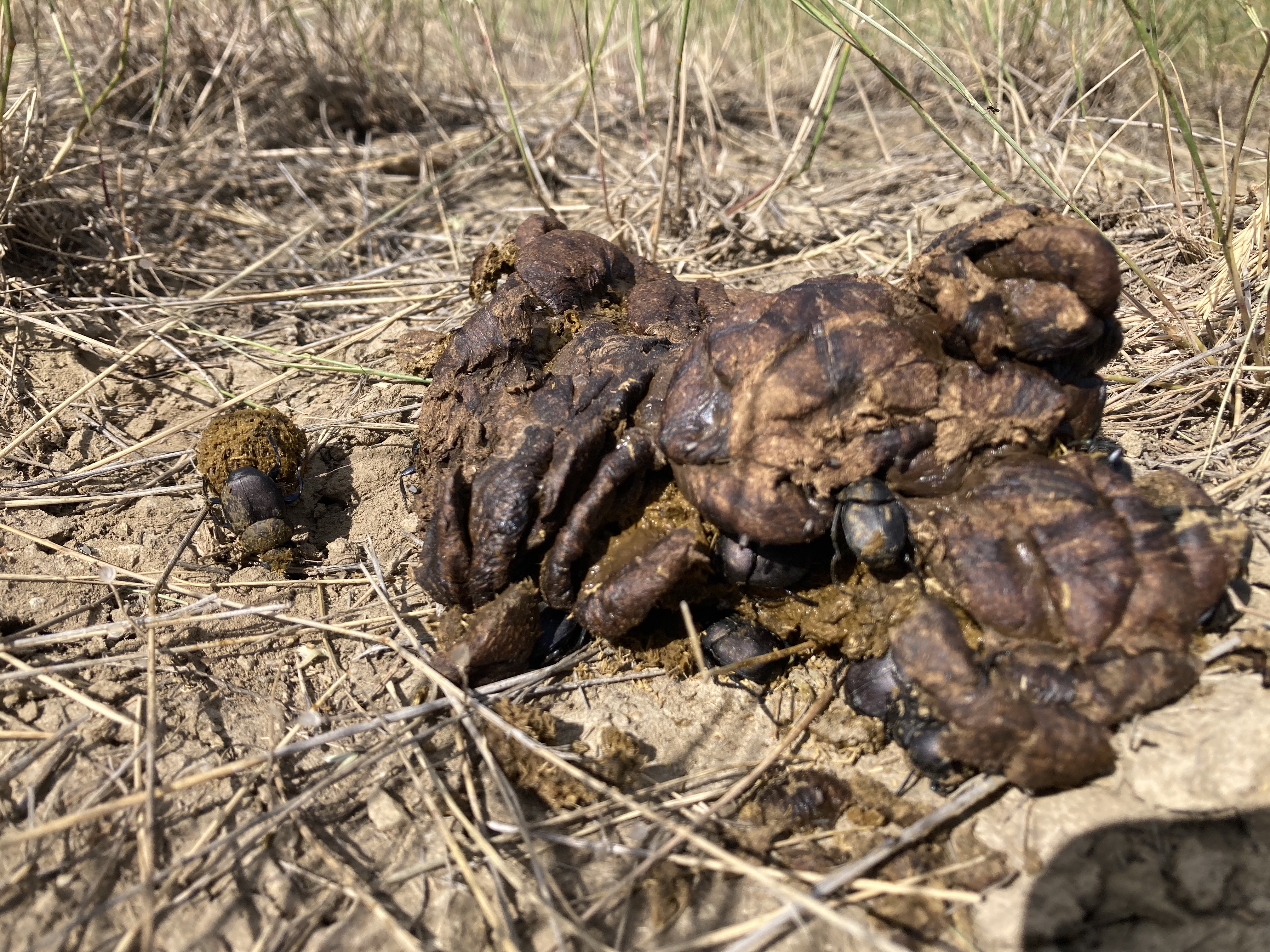 Dung beetles at work! The industrious male beetles create balls out of fresh dung, and if a female likes the look of his ball, the pair rolls the ball away and buries it. They then mate and she lays an egg in the ball so that the hatchling will have plenty of food. In this article from the San Diego Zoo I learned that “Some dung beetle mothers stay with the ball for two months, cleaning the larvae (called grubs) that hatch and removing their feces.” This is a great example of an invertebrate parenting strategy, which are more common than one might expect. Dung beetles employ a very effective method of manure dispersal that helps incorporate and recycle nutrients into the soil across the prairie. I’m always excited to see a manure pile covered in beetles!