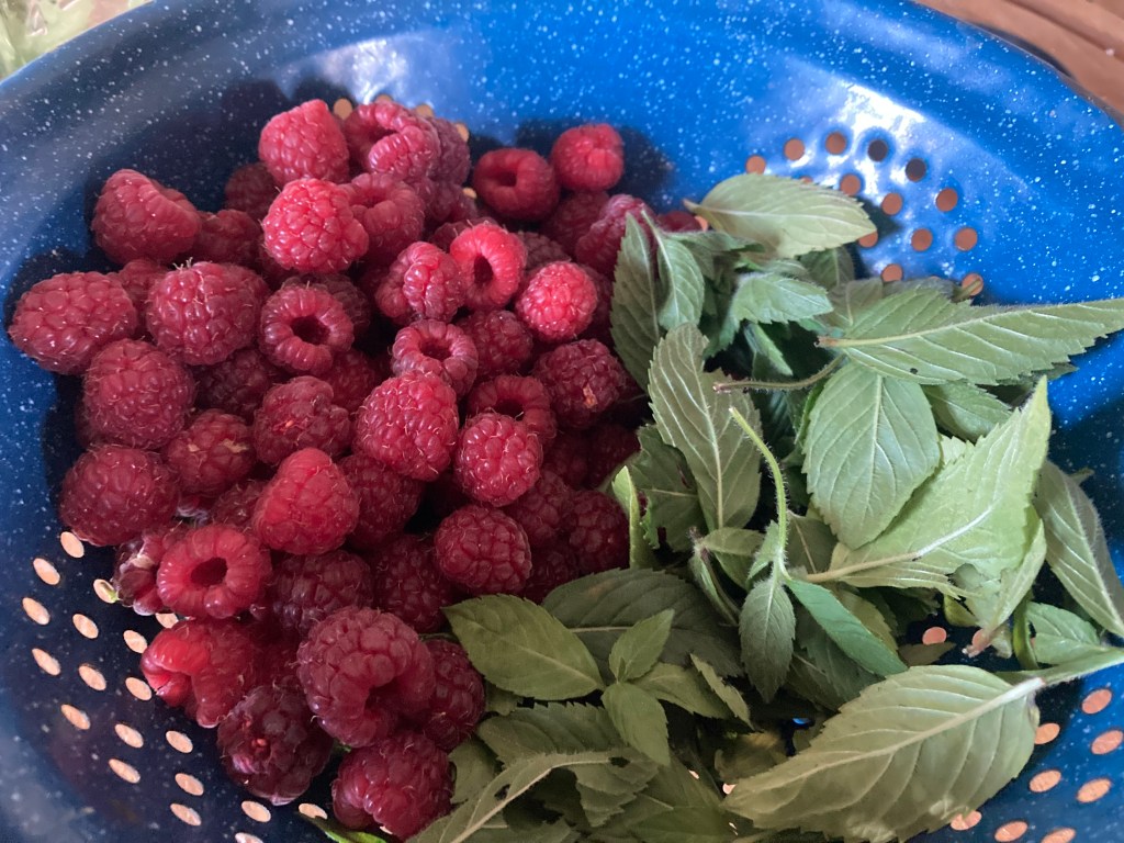 Gifts from the garden! We had SO many raspberries this year. Every couple of days I would gather a pint or two to munch throughout the day. Even so I overlooked several ripe, heavy berries that fell to the earth for other critters to enjoy. The mint also grew prolifically. I gathered and dried about 12 cups of leaves. When the cooler days of fall arrive, I’ll turn some of the mint leaves into a salve and make tea with the rest. A BIG thank you to my mom for taking all the dried leaves off the stems and putting them into jars for storage!